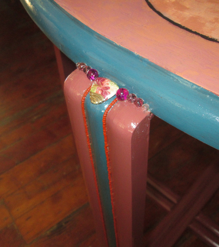 Above are the baubles and beads on the legs flanking the (Modigliani-inspired) face. The center doodad on each side leg is a beautiful earring that MamaLiberty happened to include in a package as I was working on this project. A nice bit of serendipity; the earrings are perfect. ML also later provided paints I needed to finish the tabletop (so I wouldn’t have to break my rule of using only materials on hand — nothing bought).