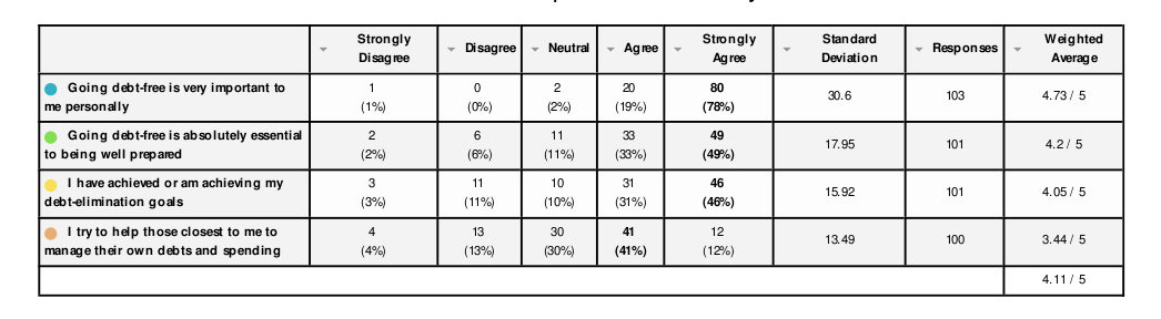 Okay, getting back to that rudely truncated reader survey on debt and preparedness … the survey company was kind enough to give me a couple of free days in which I could grab the accumulated results.