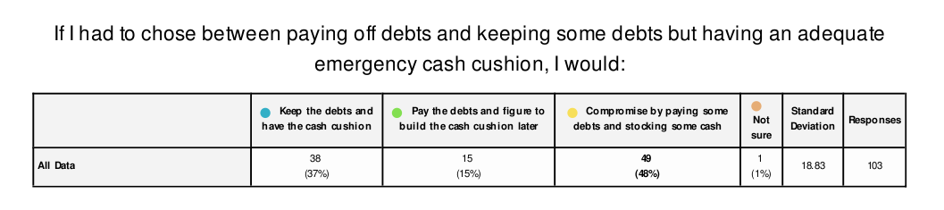 On question two, a plurality of respondents said they would compromise if faced with a choice between paying off debts and building up an emergency cash cushion, but again thoughts on that question altered as the survey went along. Initially the two most popular options ran neck-and-neck: