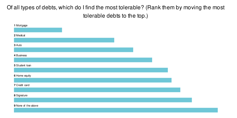 On the third question, ranking different types of debt by “most-to-least tolerable,” I at first thought people weren’t understanding the ranking process. But that was just my error of perception; I was surprised to find mortgage debt so hated — more than credit card or auto debt. But the overall judgment on that remained consistent from the first answers to the last. (I do apologize, though. I don’t think I designed this question well.) Note that in the bar chart of results, the types of debts ranked as most tolerable are at the bottom, though in the question you moved them to the top.