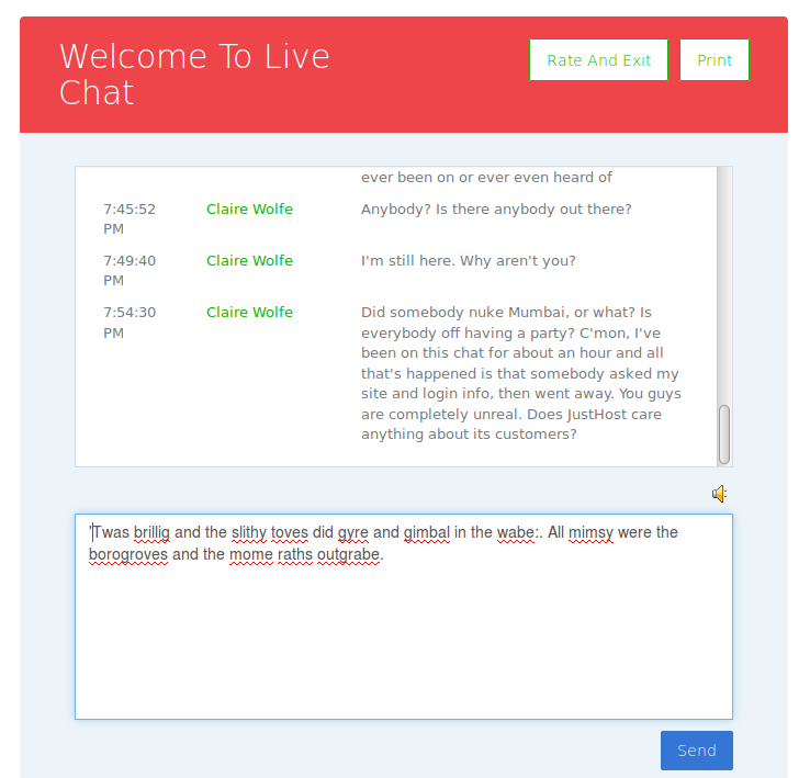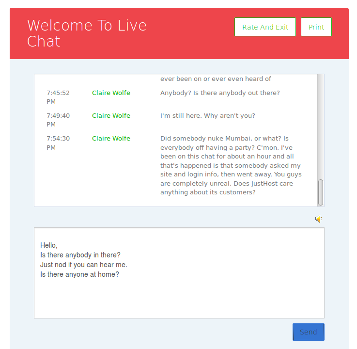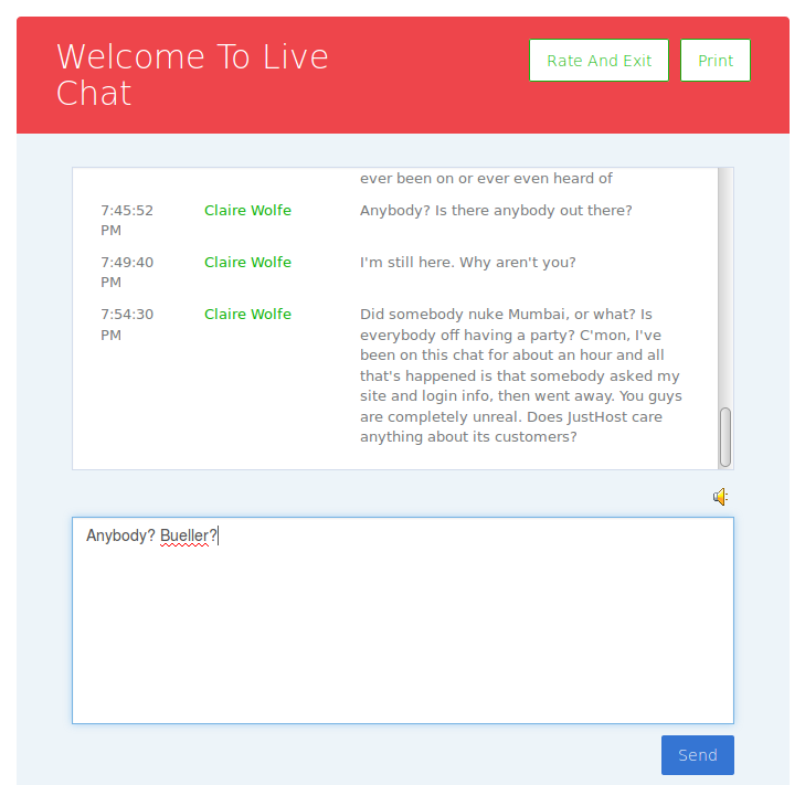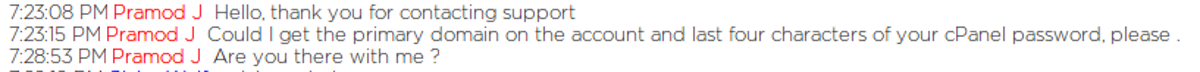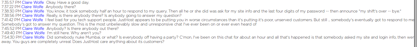 And those, dear friends, were the last words ever spoken to me by JustHost tech support. I wished Pramod farewell, waited for his replacement, and the remainder of our “dialog” looked like this: