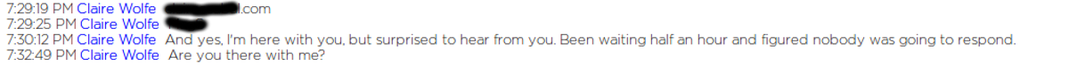 After that, the chat window entirely quit responding. It would accept no further input from me, but at the same time, it wouldn’t allow me to end the chat, other than by closing the browser window.