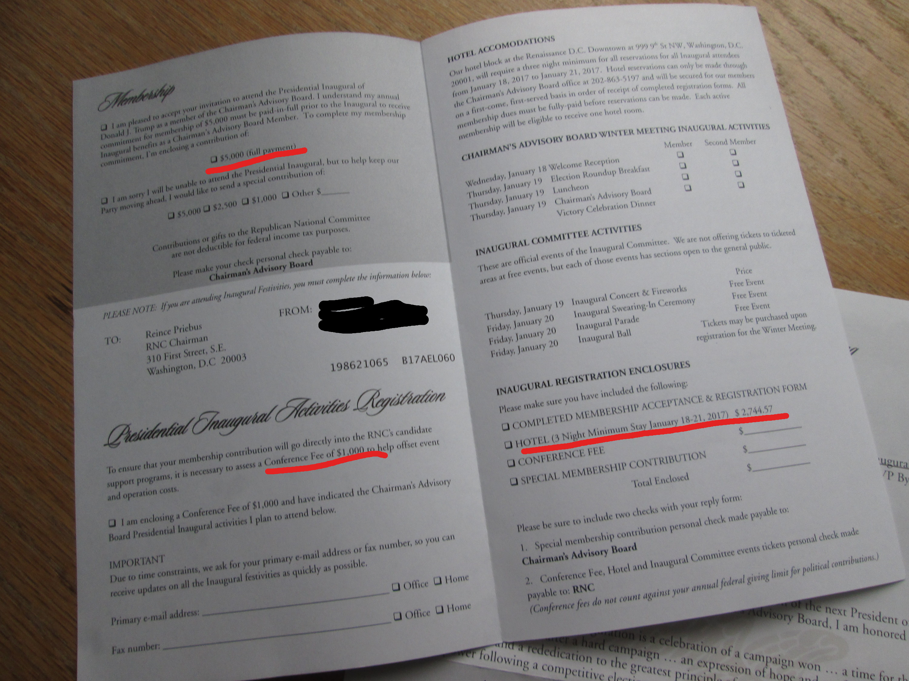 Yikes. $5,000 just to stay on the freakin’ mailing list; excuse me, I mean remain a vital member of the Chairman’s Advisory Board. Plus a $1,000 “Conference fee” for the flimsiest reason any direct-mail moneyraiser ever thought up: “To ensure that your contribution will go directly into the RNC’s candidate support programs” ($5,000 isn’t already enough for that?). Plus $2,700 for a hotel room ($2,744.57 to be precise; these people are serious about nickel-and-diming — not to mention pennying — their donors to death). Don’t they have any Motel 6s in DC? A KOA? Youth hostels?