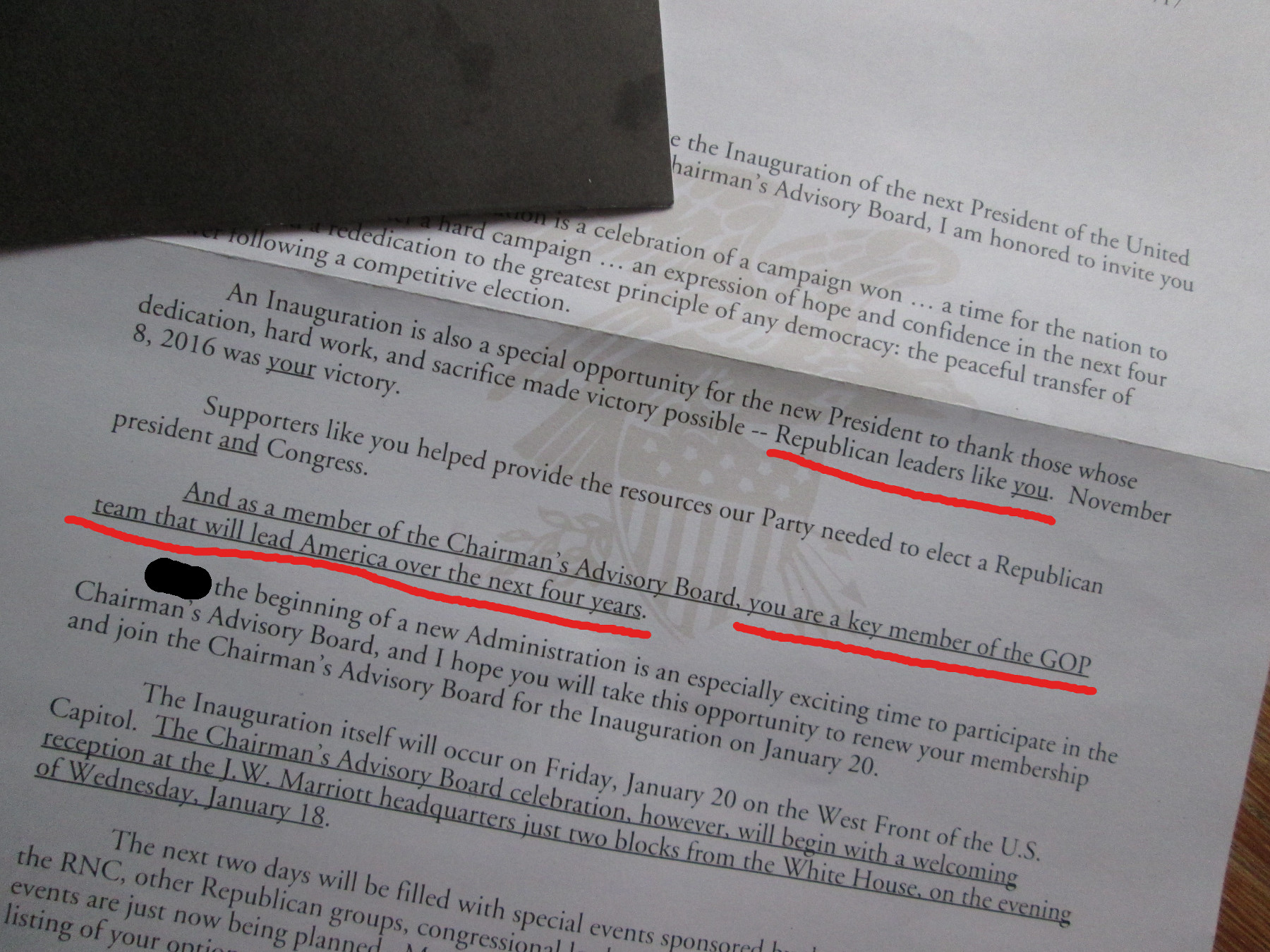 Finally, with no disrespect whatsoever to our faithful party Comrade, I also note that my inaugural invitation is printed cheaply on low-grade paper. And you know, country club hotshot and important Republican leader that I suddenly am, I expected at least Crane’s Crest 100% cotton. Or perhaps a dignified faux leatherette with a light touch of embossing and gold leaf. I am indignant and disappointed in my (formerly) good friend Reince. He clearly underestimates the key role I play in the Trump administration and the future of the Republican party.
