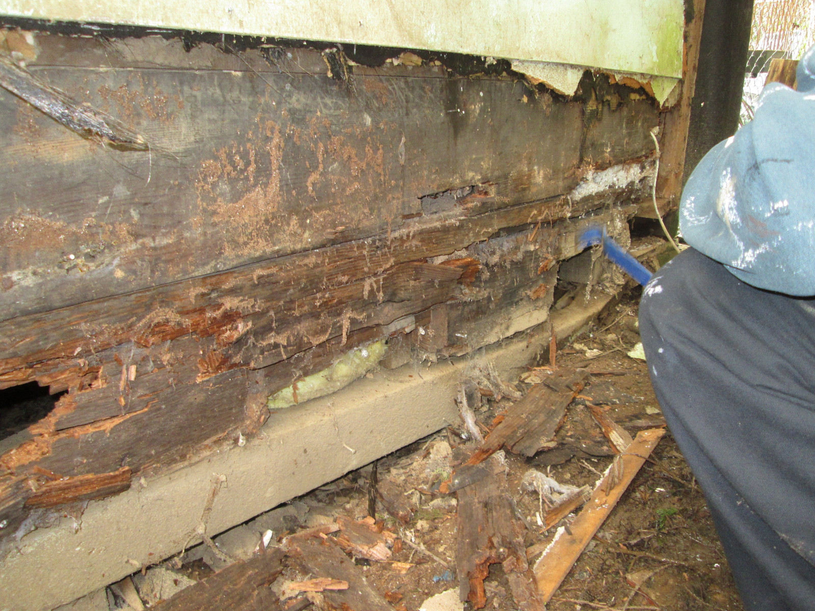 So. This morning we went outside to tear away siding and general rubble at the base of the house to get an idea how bad the beams and joists of the bedroom floor were.