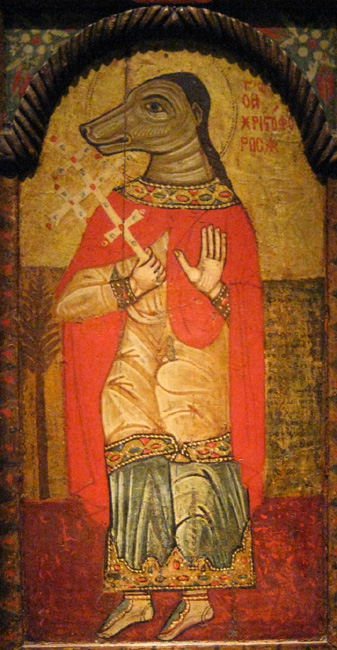 That quest also led me down a rabbit hole of other saintly trivia. Did you know that (the former, if you’re Roman Catholic) St. Christopher was believed to have had the head of a dog until his alleged encounter with Jesus? See? That’s Christopher, not Guinefort the Greyhound, below. Man, I’ll bet that sight scared the heck out of the Baby Jesus when he met (even though, as of the 1960s, he probably no longer did meet, if you’re Roman Catholic) Christopher on the road.*