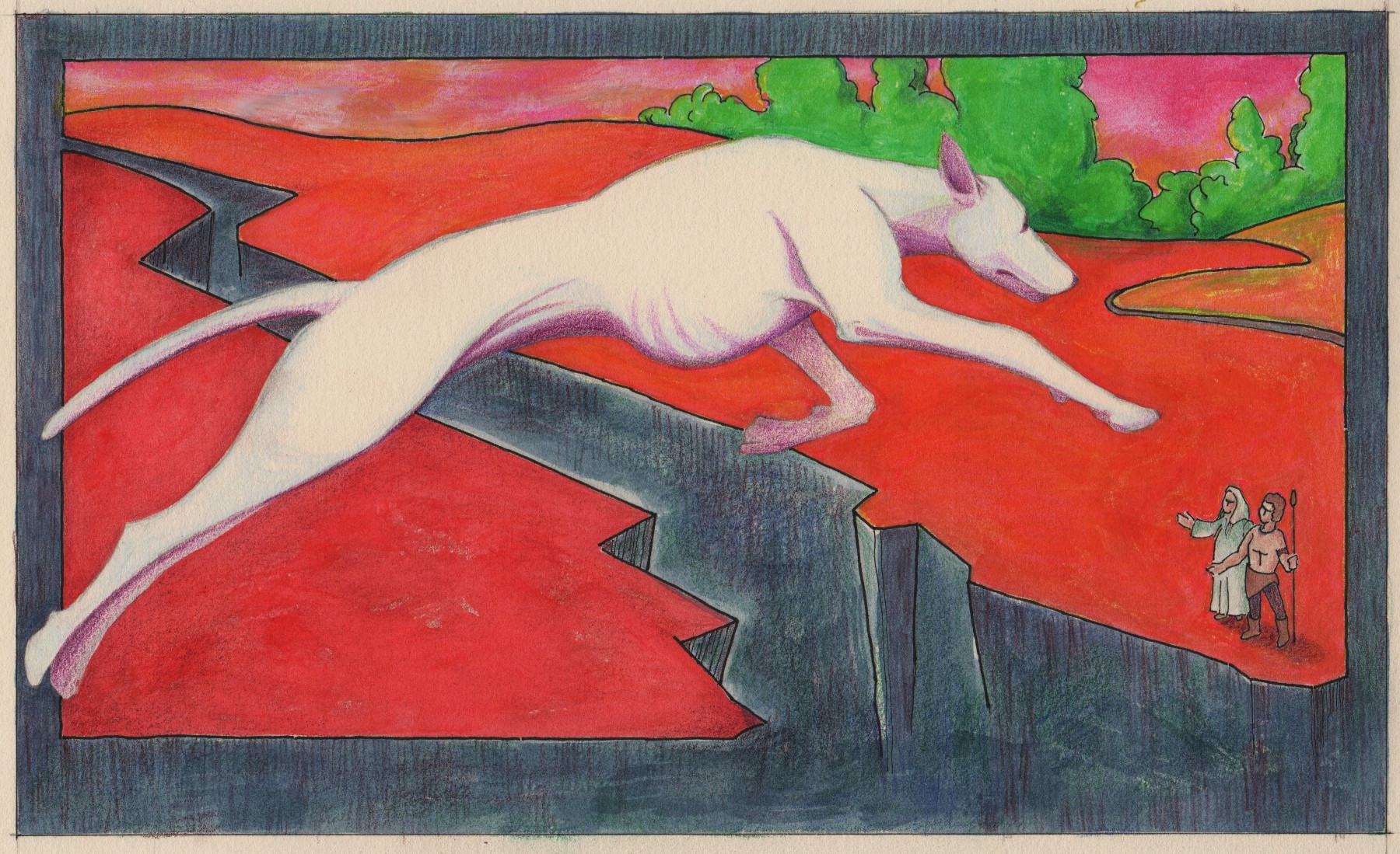 Even the dog’s facial side view indicates its intent and determination to reach the humans. And the people, as small as they are, are well-delineated (and with shadows yet!). Very well done.