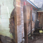 Naturally, when we (the Wandering Monk and I in one of the first jobs he did for me) ripped off the remaining bits, we found rot in the west wall. It was manageable, but for a year after that I lived with a patchwork wall covered in the Dreaded Tarpaper. Even as we began the final work this May, the west wall continued — and continued to continue — to look like hell.