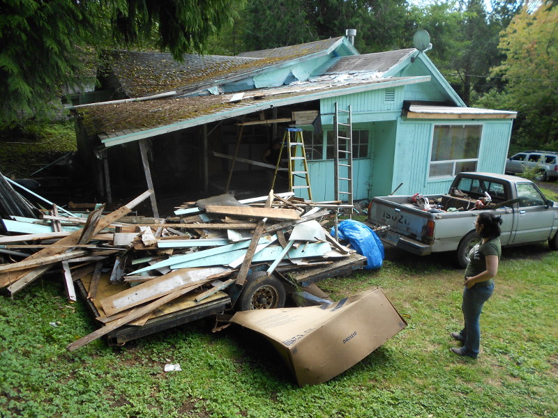 Just in terms of junk removal, I’ve gotten rid of easily 10,000 lbs of trash and debris, construction and otherwise, as well as almost the same of scrap metal. Demolition of one of the “closets” inside the house – a small, triangular thing behind the woodstove and only just attached to one of the main posts of the house – took me an entire weekend and left me with four or five dozen pieces of wood, none of which were standard dimensional lumber, and close to 7 lbs of nails. 🙂