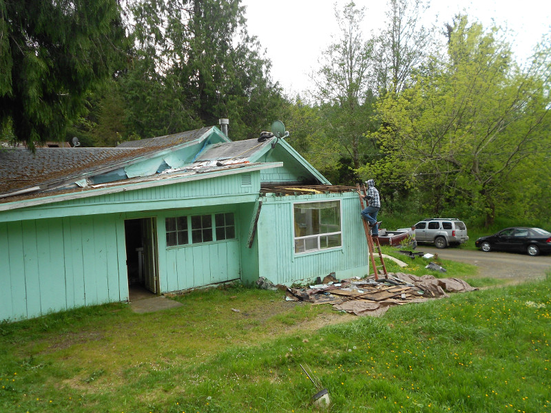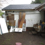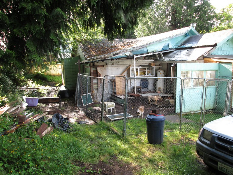 Grafted onto the northwest corner of Ye Olde Wreck was this strange growth I dubbed the Not-A-Garage. Photos don’t begin to show how terrible it was. The mud floor. The rain that poured inside it. The deck your foot would go through if you weren’t careful. Above all, the crazy roofline. Look at the goofy roof on that thing!