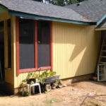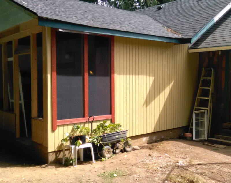 That was a week ago. The Monk left and since then it’s been up to me. I’ve been hard at work. Nailing up edge flashings. Caulking. Priming. Painting. Stretching window screens. Caulking and painting some more. And finally measuring, cutting, and putting up trim.