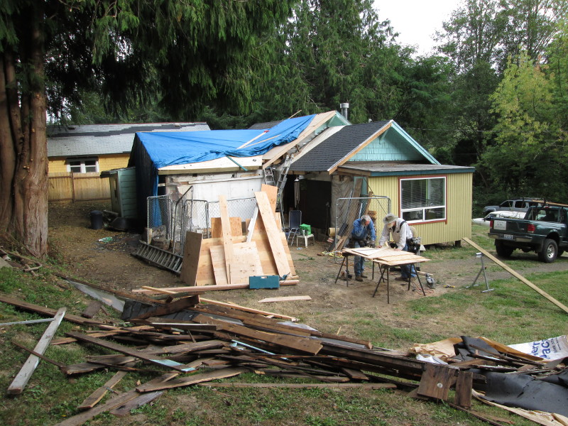 May, June, July … pure ugliness. There was progress, of course. In the pic above of the Monk tearing off the corner you might notice the foundation has been replaced and raised. But not until this month did walls begin to look like walls.