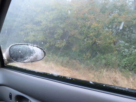 It rained on and off all day. On the way home, it hailed on us so long and so hard we had to pull over to the side of the road. It was merely mini-hail, which is the only kind we ever get here. No midwestern golf balls or car-denting baseballs. But it was coming down like thunder. By the time the hail finally eased up, the road was white and crunchy.