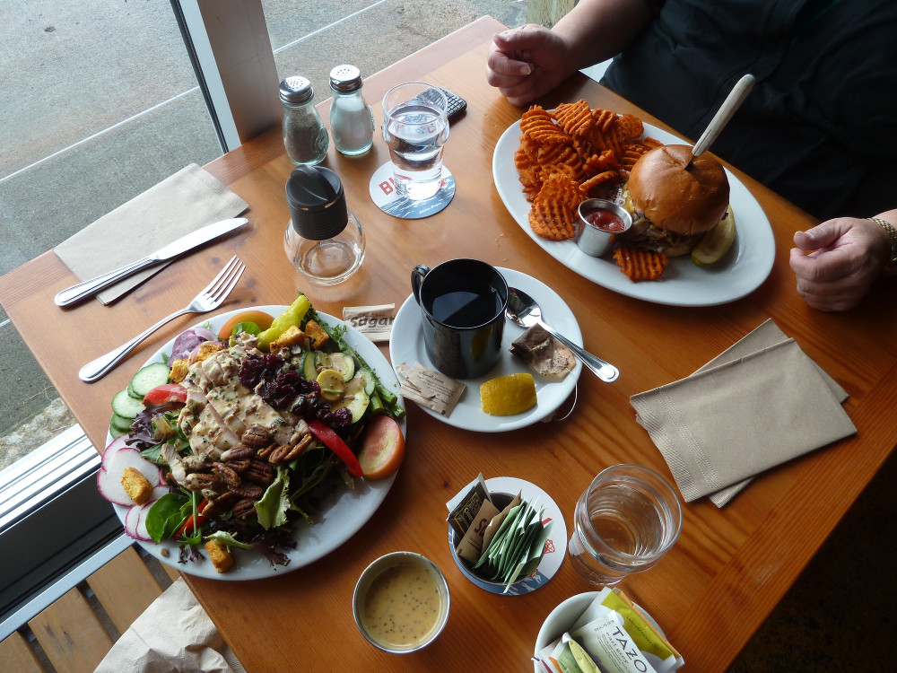 J’s was a buffalo burger with seasoned sweet-potato fries. Mine was this fabulous, huge salad with sliced chicken breast and candied pecans sitting atop every conceivable type of fresh green, fresh vegetable, and pepper. It came with a honey mustard dressing that made me want to lick my fingers.