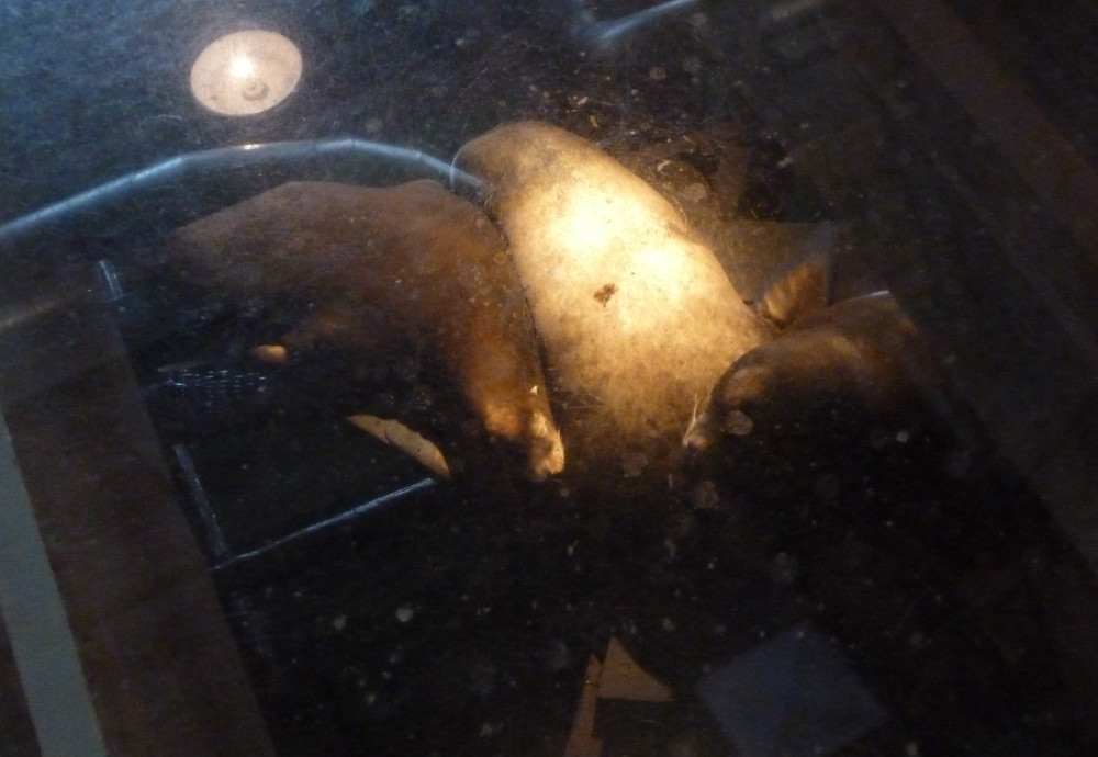I’m sorry; I know it’s hard to tell what you’re looking at, but those are three sea lions snuggled together on the understructure of the building. Two smaller, darker ones resting their heads on one great big light gray one, all three happily snoozing. If you click to embiggenate you can see the two whiskered noses pointing toward each other.