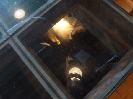 I noticed when we came in that part of the floor near the entrance was made of glass. When we were leaving, I peered down and saw these guys: