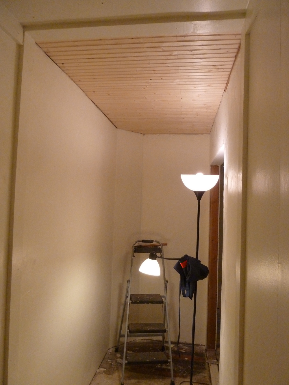 Here’s detail of the ceiling. I love this lightweight T&G pine. It’s attractive, inexpensive, and easy to put up. Same stuff I used on the bedroom ceiling.