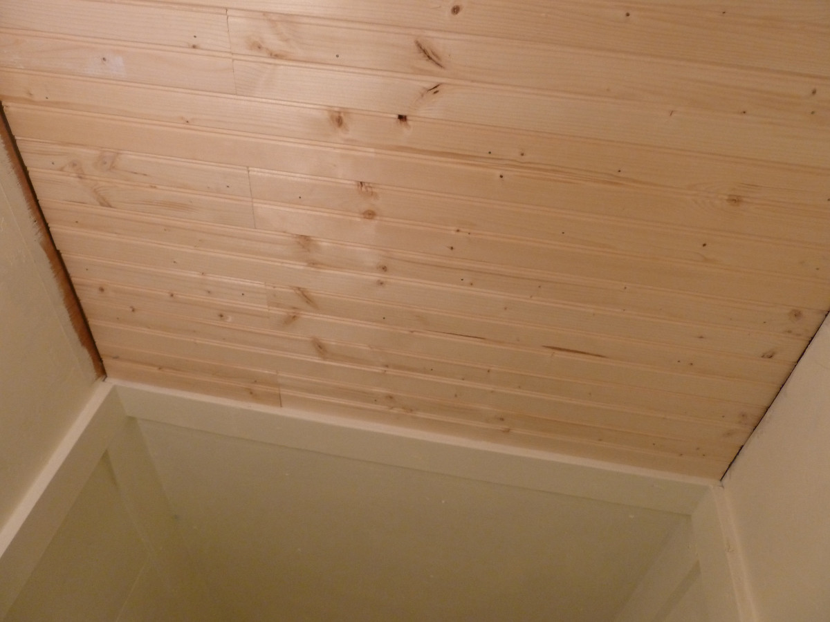 The clothes closet portion has a tongue-and-groove wood ceiling, which I installed yesterday (a pleasant job, for a change). And it will have proper baseboard and crown moldings.