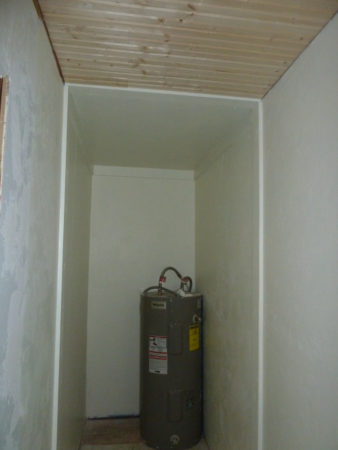 Befitting a utility closet, it’s much more utilitarian. No wood ceiling. Non-fancy 1×4 trim. And yes, ExpatNJ, it has potential to be a short-term safe room, especially given that water and some food will be stored there. But for the moment, the two closets will be divided only by a curtain, so it’s not a secure room at all and may never be.