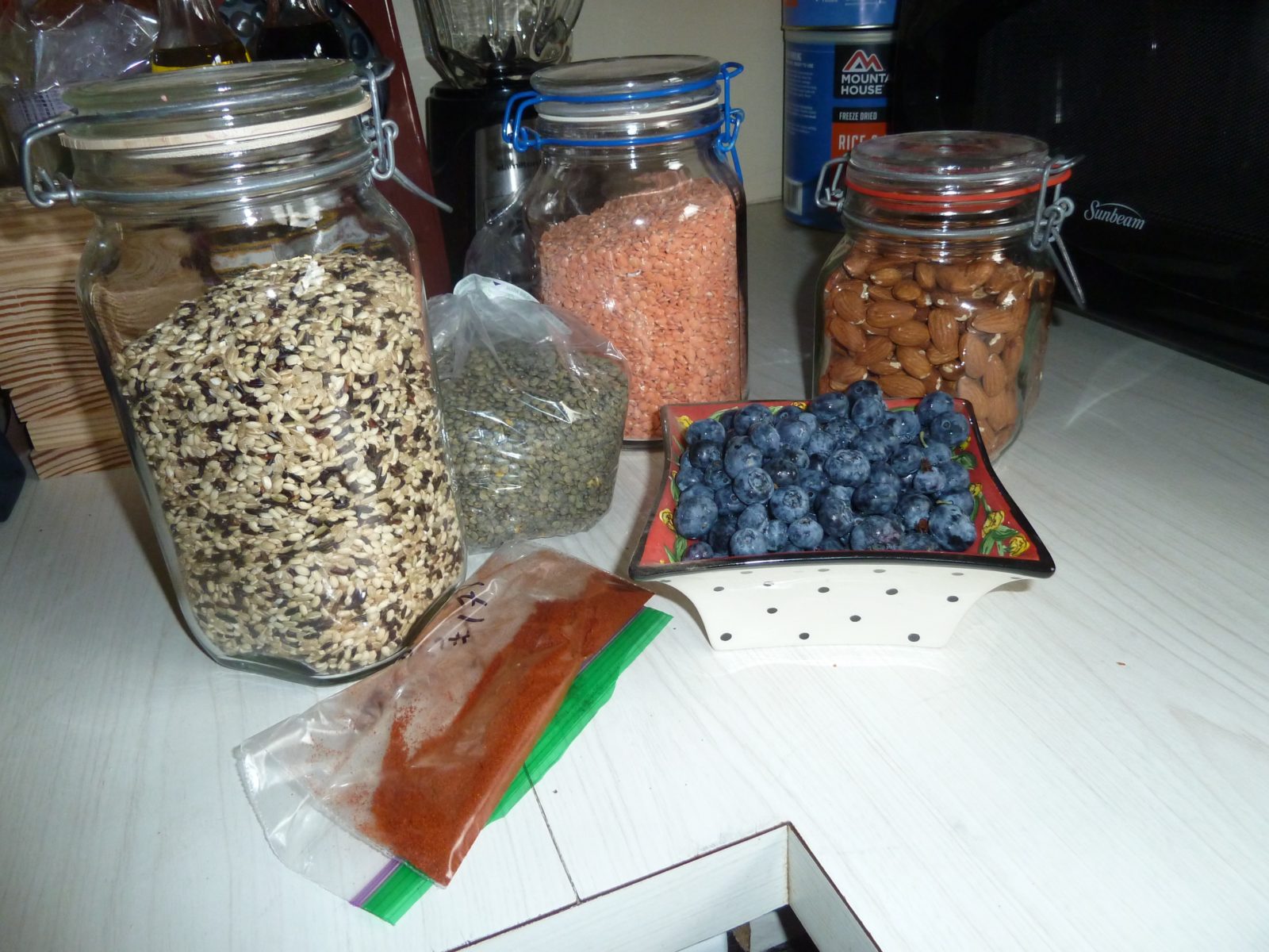 In the photo: Wild rice blend, organic French green lentils, red lentils, raw almonds, local blueberries, and one of the four varieties of paprika the bulk food store had to choose from.