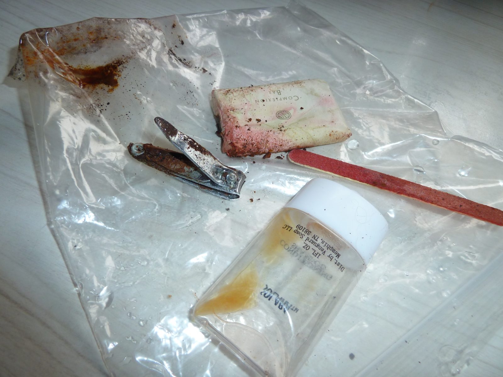 The ickiest problem was minor and didn’t come from water or age. In a small bag of toiletries, I’d put a travel-sized bottle of shampoo. Reminder to self: Never put a pop-top item of liquid into a kit; always use screw caps and make sure they’re securely fastened.