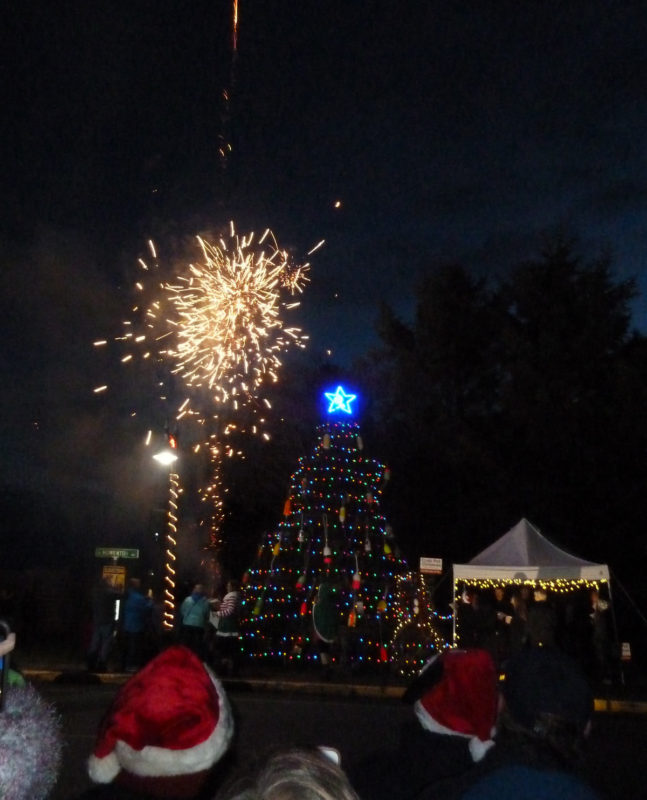Neighbor J and I trekked to tree-lighting festivities at a coastal port. It was kind of a boring ceremony. Very small-town and mostly for the locals, which we weren’t. But the moment the tree lit up and the fireworks went off was pretty spectacular.