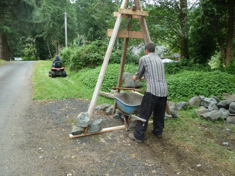 Part of this week’s wall-building endeavor involved a lawnmower-powered hoist. Like so: