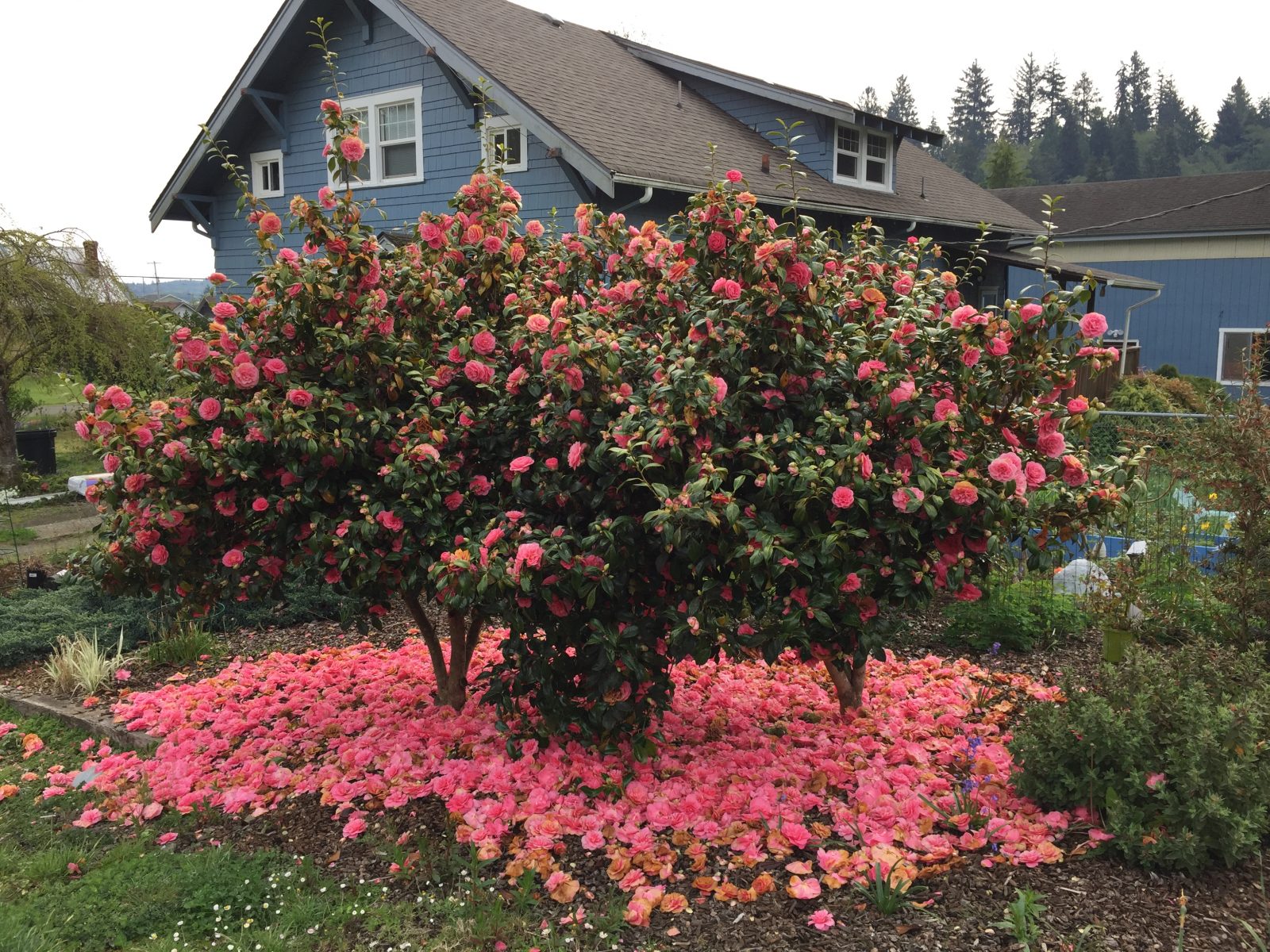 Lovely camellia bushes, just enough past their prime to have a carpet of fallen blooms and a richness of blooms in place at the same time. It’s been a tremendous year for camellias. My own camellia isn’t so pretty …