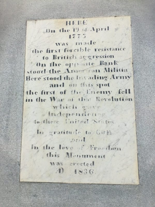 This inscription is on an 1836 obelisk erected where the British forces stood, directly across the Old North Bridge from the Minuteman statue, where the Americans faced off against their invaders. They don’t make politically incorrect inscriptions like that one any more.