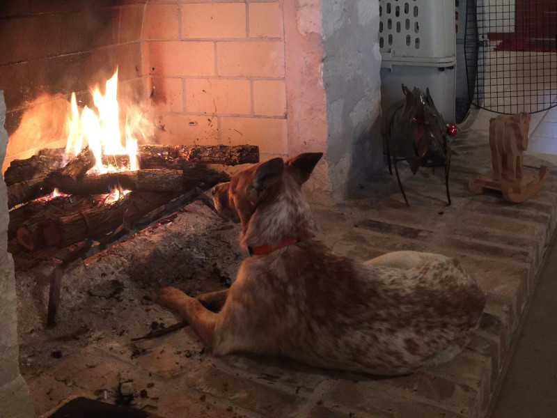 Don’t worry; we didn’t let her stay in the fireplace very long. But she’s entranced by fire and pouts if we put up the screen between her and the flames.